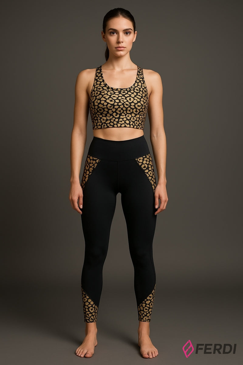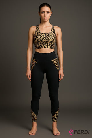 Conjunto deportivo de dos piezas compuesto por top y leggings. El top tipo crop presenta un diseño con estampado animal print tipo leopardo dorado que ofrece un look moderno y dinámico. Los leggings en color negro incluyen paneles laterales y detalles en los tobillos con el mismo estampado, brindando una combinación elegante y estilizada. Fabricado con materiales elásticos y transpirables, ideal para entrenamientos, yoga o uso casual, proporcionando ajuste cómodo, libertad de movimiento y estilo.