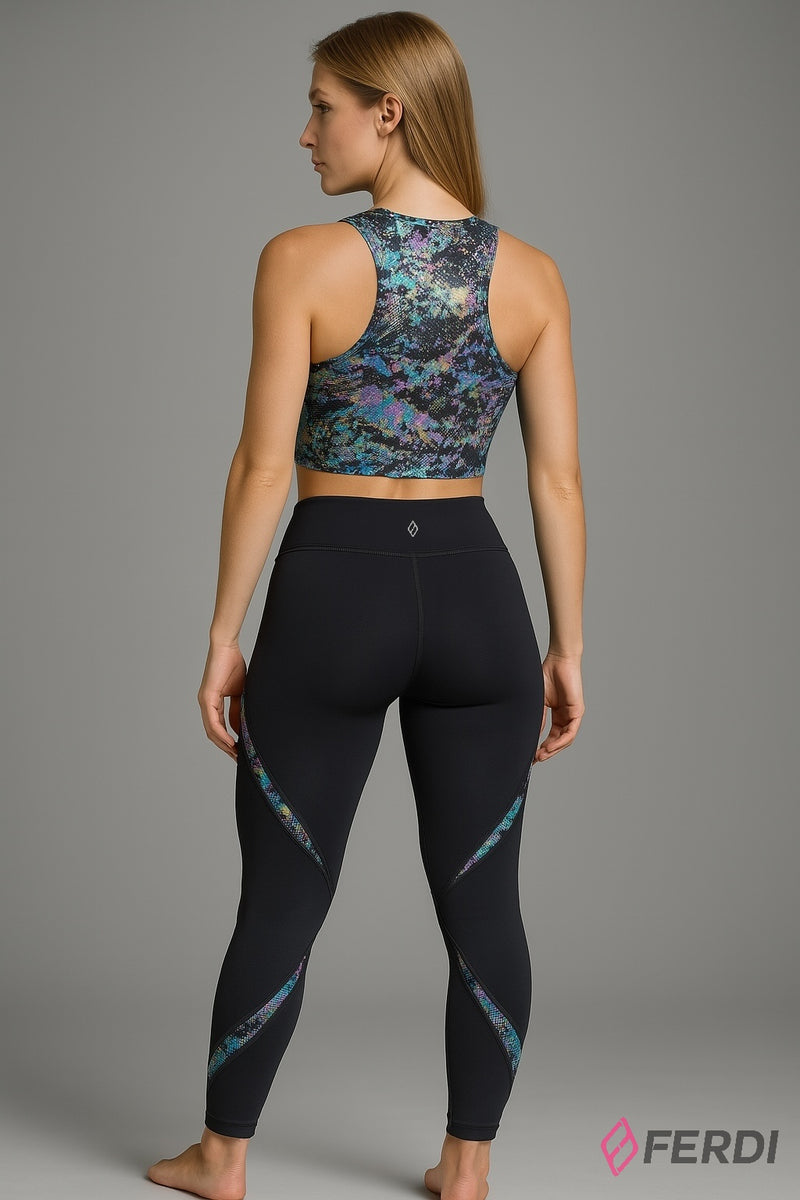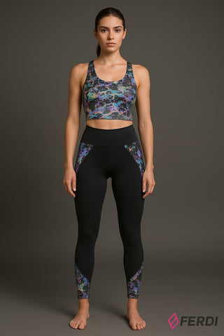 Conjunto deportivo de dos piezas compuesto por blusa crop y leggings. La blusa tipo crop presenta un diseño con estampado abstracto multicolor que ofrece un look moderno y dinámico. Los leggings en color negro incluyen paneles laterales y detalles en los tobillos con el mismo estampado, brindando una combinación elegante y estilizada. Fabricado con materiales elásticos y transpirables, ideal para entrenamientos, yoga o uso casual, proporcionando ajuste cómodo, libertad de movimiento y estilo.