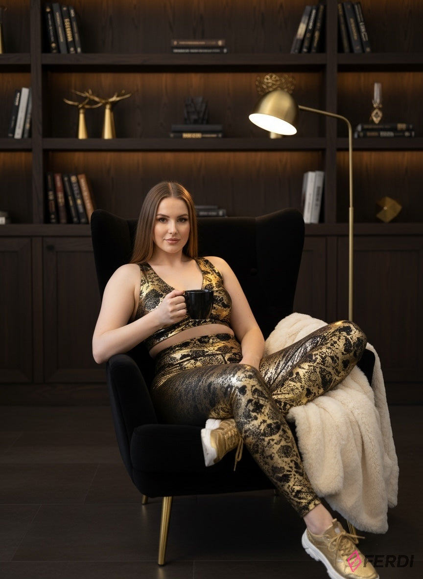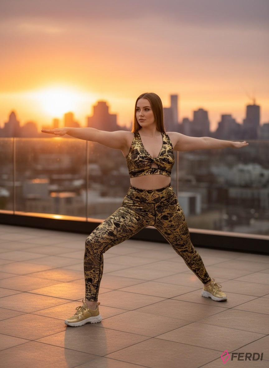El top deportivo, con su escote en V favorecedor y un elegante nudo frontal, asegura un ajuste seguro y una silueta estilizada. Los leggings de tiro alto, con su estampado de piel de serpiente dorada metálica sobre un fondo negro profundo, no solo capturan todas las miradas, sino que también realzan tu figura, brindando comodidad durante todo el día.