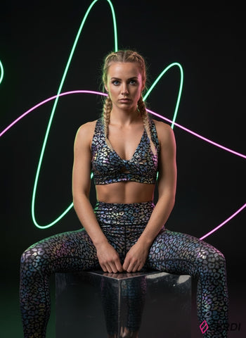 El bra deportivo de soporte medio presenta un audaz estampado de leopardo iridiscente que cambia de color con la luz, creando un efecto visual dinámico y único. Su diseño con un nudo frontal no solo es estéticamente atractivo, sino que también ofrece un ajuste cómodo y seguro, ideal para cualquier actividad, desde yoga hasta entrenamientos de alta intensidad.