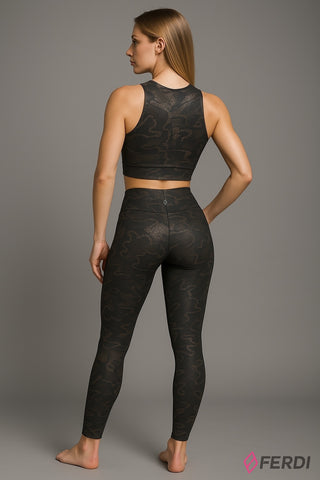 Conjunto deportivo femenino con diseño animal print muy discreto y formal. Top con nudo frontal y leggings de tiro alto, elaborados con tela suave, elástica y de compresión ligera. Perfecto para un look sofisticado en tus entrenamientos, yoga o actividades diarias, brindando comodidad y estilo sin esfuerzo.